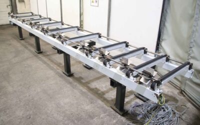-Übergabestation: Förderband mit Abkippfunktion, kommt aus der Jalousienfertigung