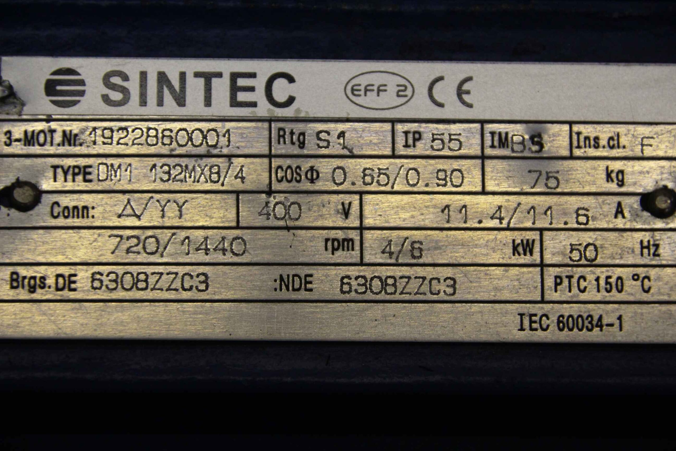 Elektromotor 4/6 kW 720/1440 U/min von Sintec – DM1 132MX8/4 im Zustand: gut und am Standort der Ware: 26215 Wiefelstede, DE