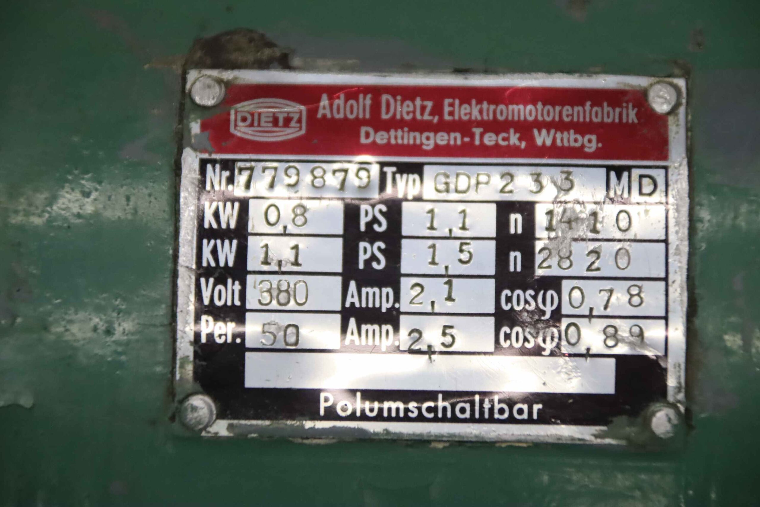 Elektromotor 0,8/1,1 kW 1410/2820 U/min von Dietz – GDP 233 im Zustand: gut und am Standort der Ware: 26215 Wiefelstede, DE