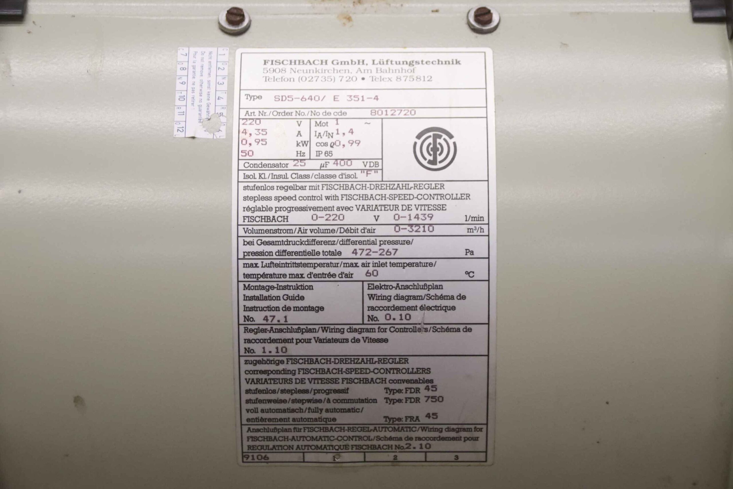 -Hersteller: Fischbach, Radialventilator Absauggebläse Typ SD5-640/ E 351-4