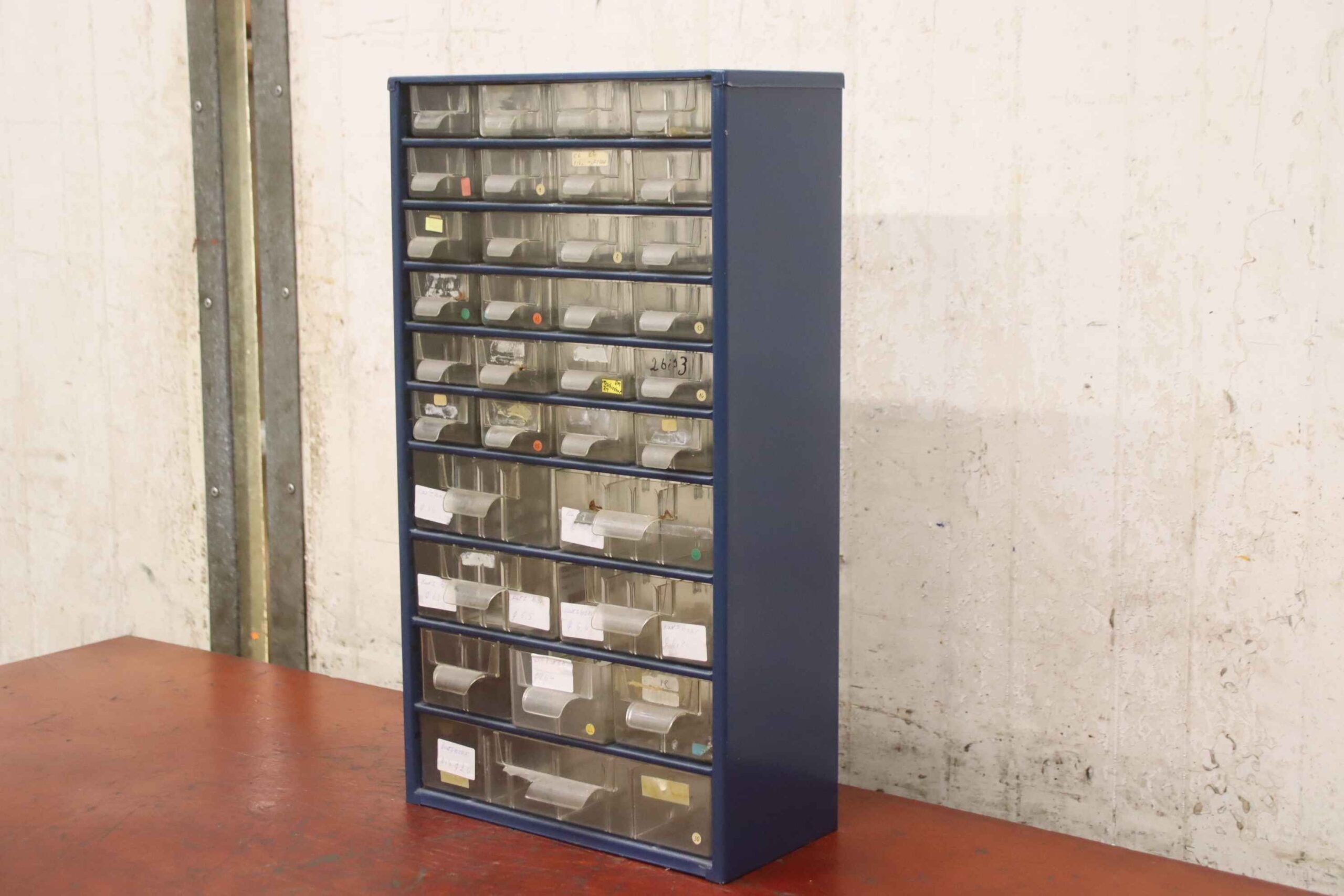 -Kleinteilemagazin: Metall Schubladenmagazin mit 32 Sichtlagerkästen
