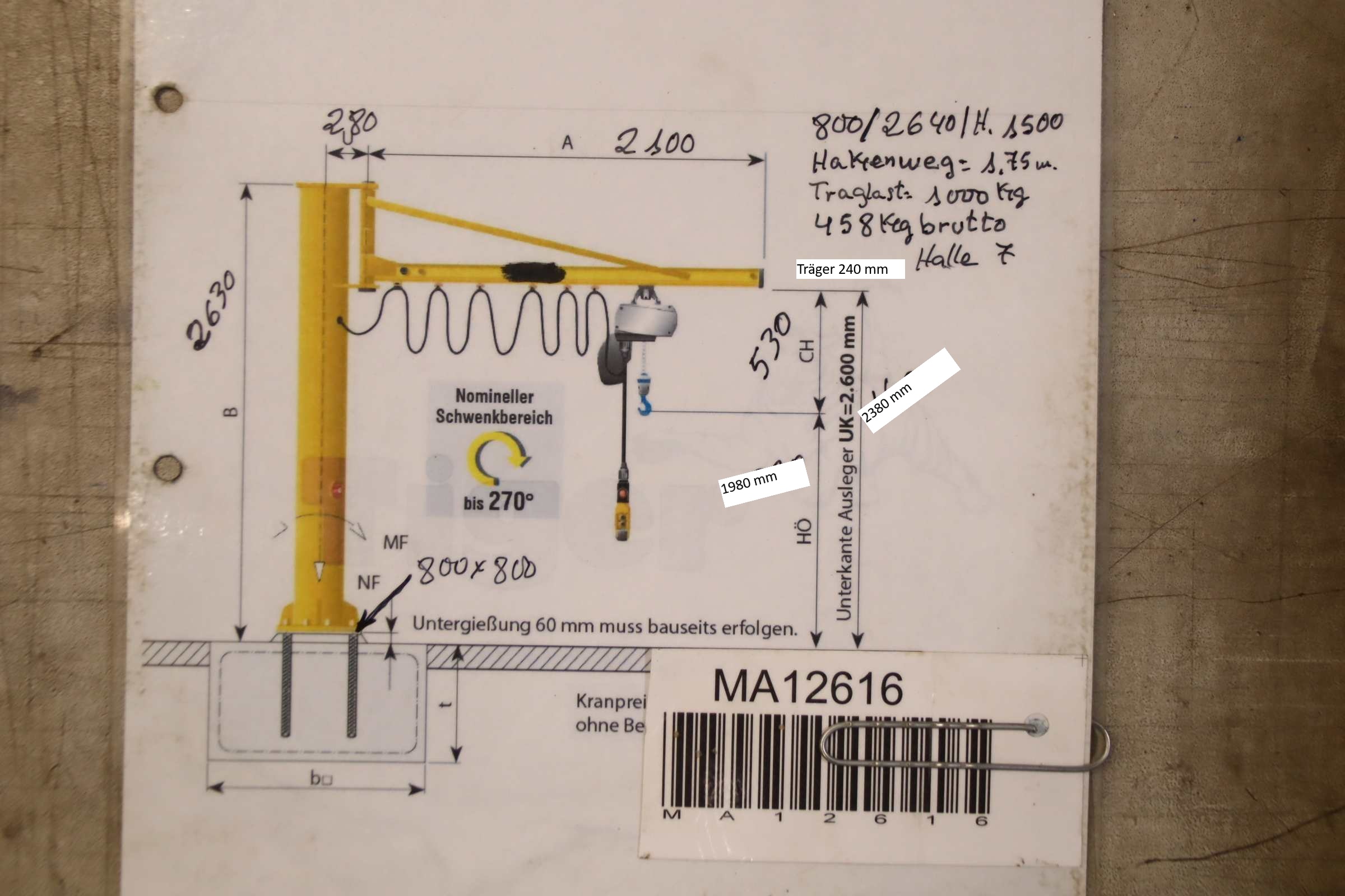 -Hersteller: KWG, Säulenschwenkkran Typ SSK-B 1,0-2,10 Tragkraft 1000 kg