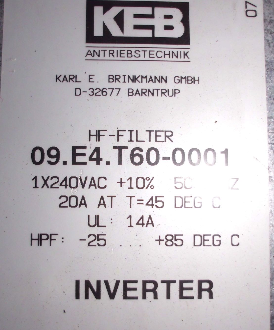 Netzfilter von KEB Antriebstechnik – 09.E4.T60-0001 im Zustand: gut und am Standort der Ware: 26215 Wiefelstede, DE