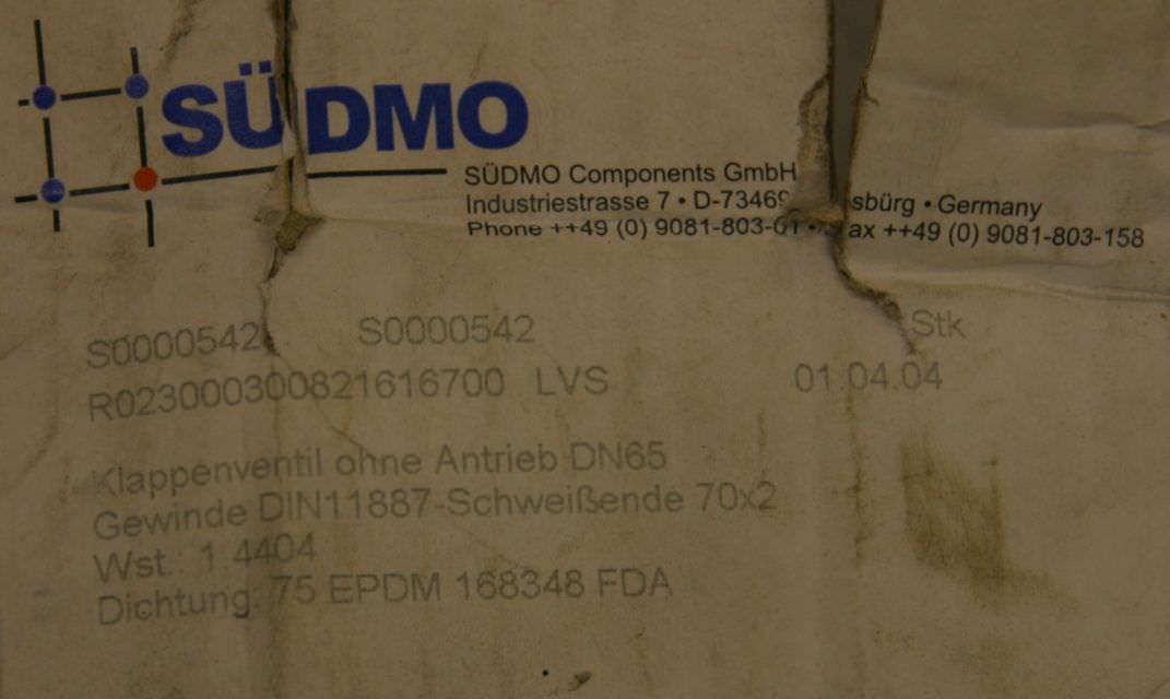 Scheibenventil DN65 von Südmo – ohne Antrieb im Zustand: gut und am Standort der Ware: 26215 Wiefelstede, DE